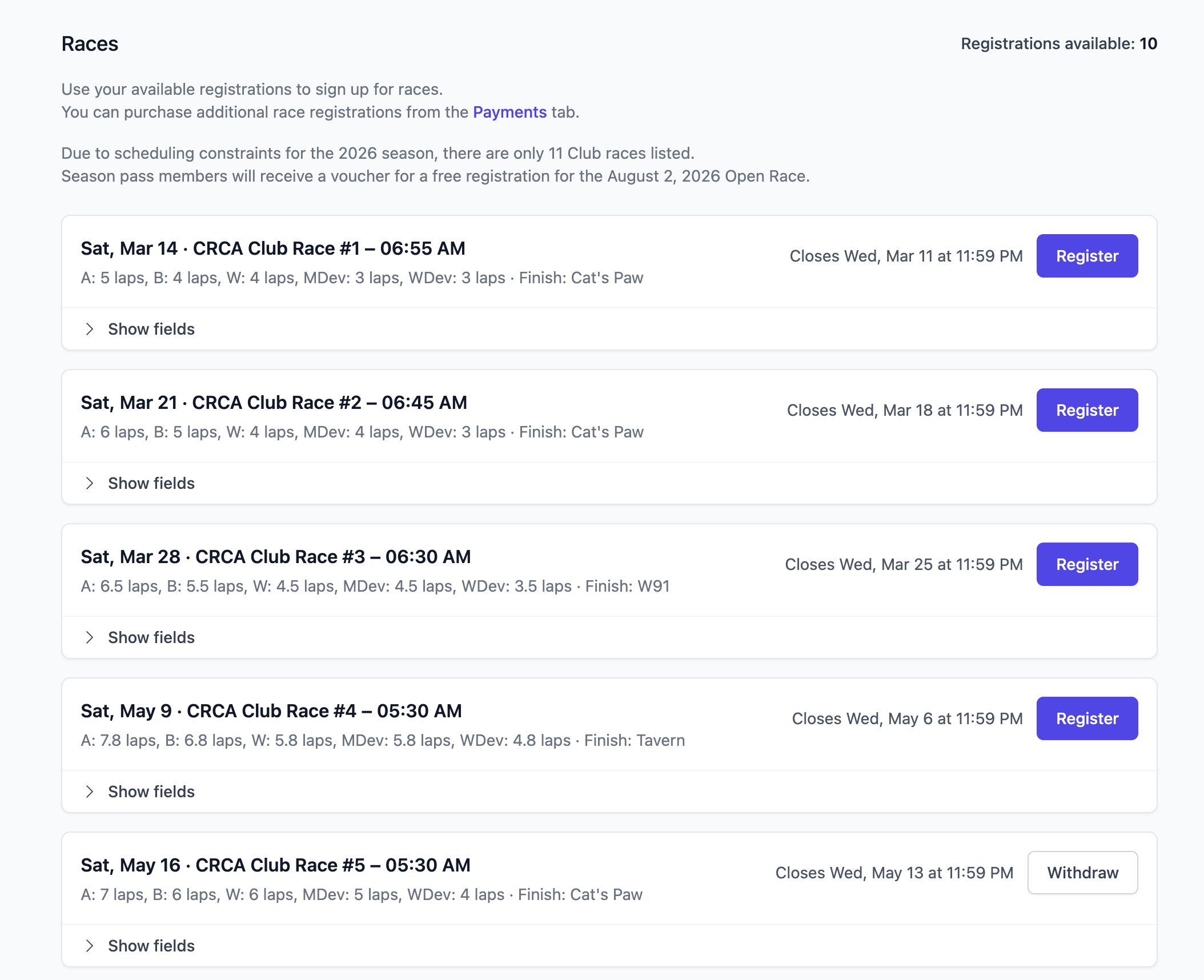 Esto se puede hacer fácilmente a través del Portal del Miembro en cualquier momento. Los miembros con Pase de Temporada, Donantes y Juveniles deberían ver 11 créditos de registro disponibles. Los Miembros Básicos pueden comprar créditos de registro a través de la pestaña de Pagos (se explica más adelante). Los créditos no se transfieren a la siguiente temporada.